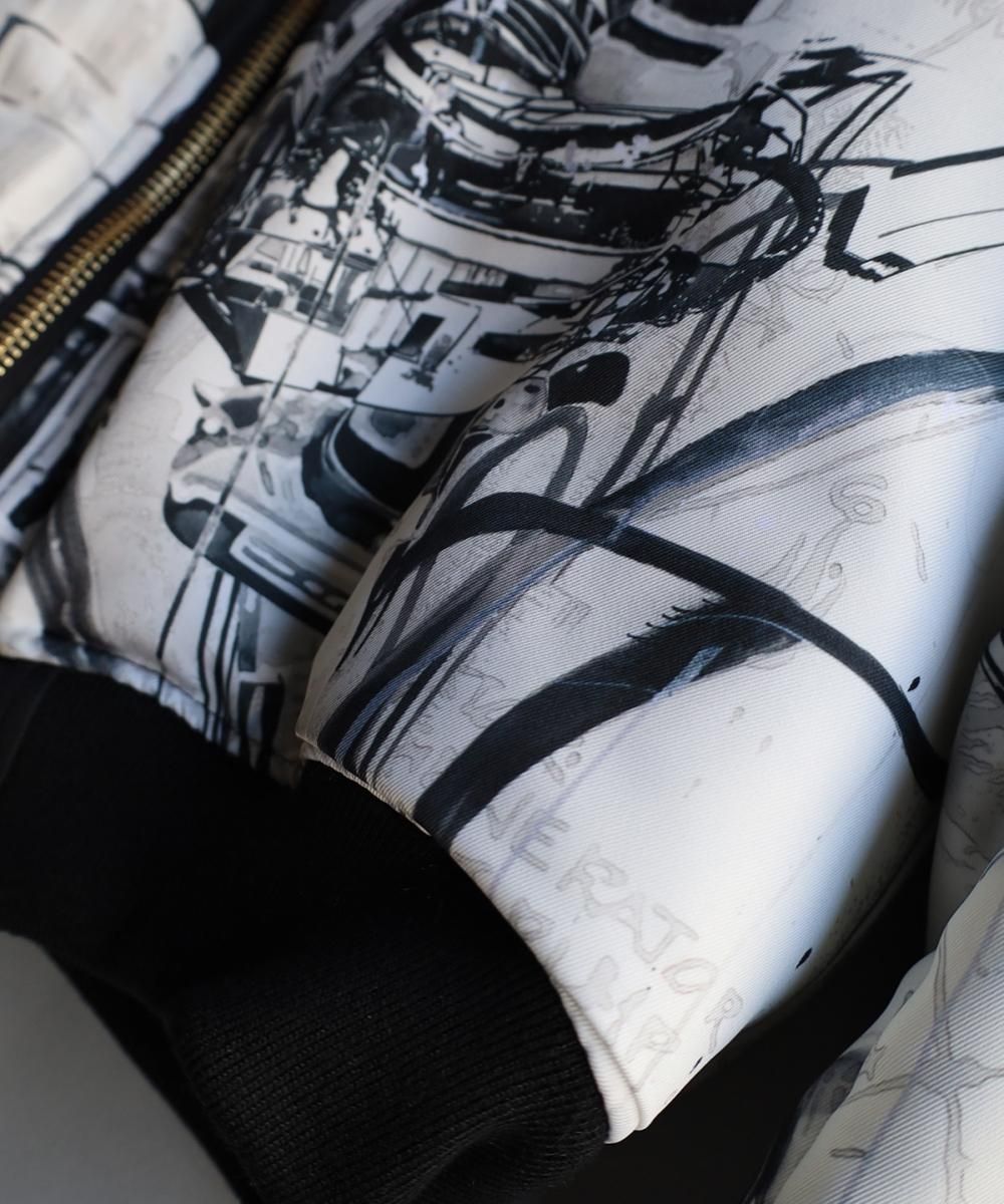 リバーシブルで、片面に佃弘樹氏のプリントを転写。リバーシブル+スリーブデタッチャブルの4形態での着用可能。たっぷりとした中綿の保有量と、ボリューム感あるゆったりとしたシルエット。